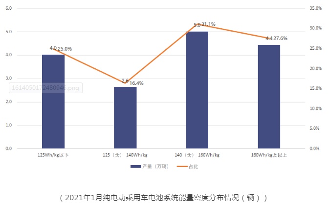 该机构还指出,受微型车产量上升带动,2021年1月中国纯电动乘用车系统能量密度在125Wh/kg以下车型占比有所上升,1月产量共计4.0万辆,占纯电动乘用车25.0%。125(含)-140Wh/kg和160Wh/kg及以上车型产量占纯电动乘用车总产量比例分别为16.4%和27.6%,较2020年12月稍有下降。