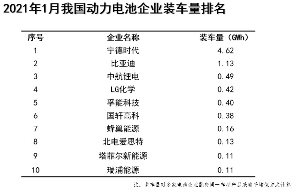 另外,1月,中国新能源汽车市场共计37家动力电池企业实现装车配套,较2020年12月减少13家。排名前3家、前5家、前10家动力电池企业动力电池装车量分别为6.2GWh、7.1GWh和7.9GWh,占总装车量比分别为72.1%、81.5%和91.8%。