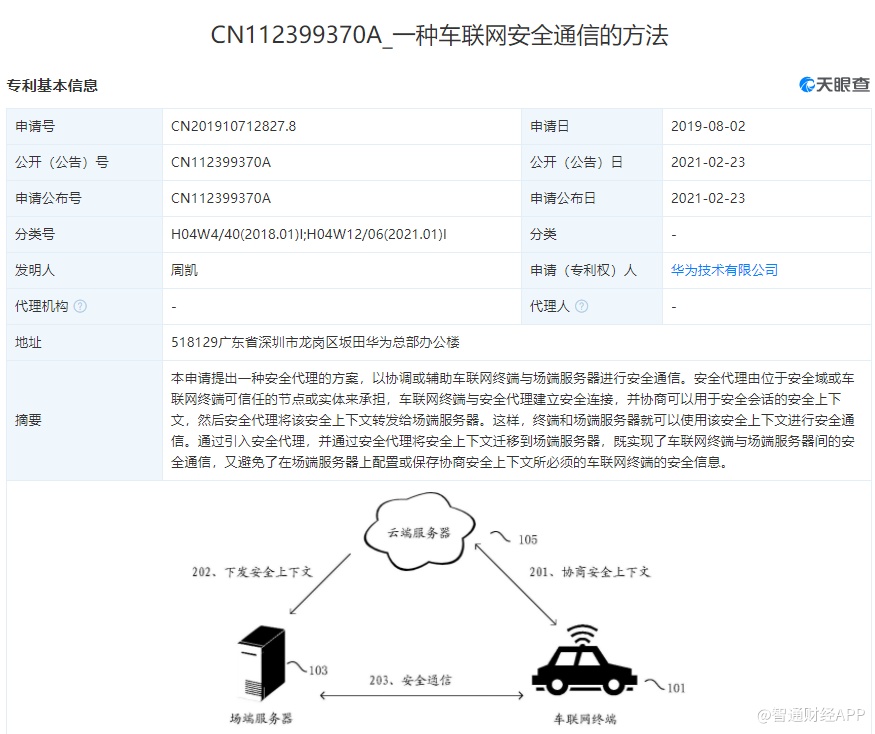 智通财经APP获悉,天眼查显示,2月23日,华为技术有限公司公开一项名为“一种车联网安全通信的方法”的发明专利,公开号为CN112399370A,申请日期为2019年8月2日。