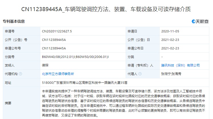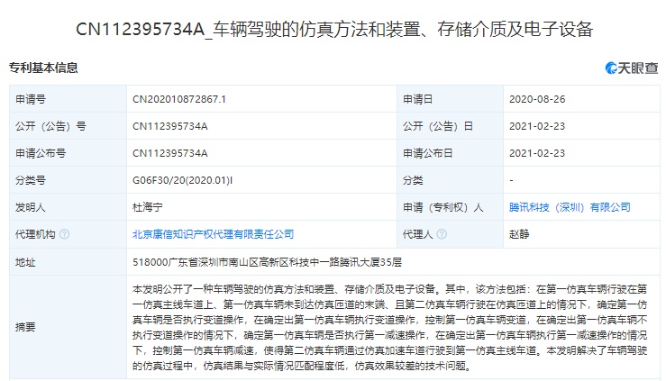 智通财经APP获悉,天眼查显示,2月23日,腾讯科技(深圳)有限公司公开两项“车辆驾驶”相关的专利,分别名为“车辆驾驶的仿真方法和装置、存储介质及电子设备”、“车辆驾驶调控方法、装置、车载设备及可读存储介质”。两项专利的公开号分别为CN112395734A、CN112389445A,申请日期分别为2020年8月26日、2020年11月5日。