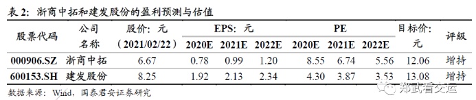 4.大宗商品涨价推高供应链企业盈利增速。大宗商品价格上涨将推高营业收入增速,而供应链企业的利润率相对稳定,所以利润增速也将提高。在头部大宗供应链企业中,浙商中拓90%左右的收入和利润来自于钢材、铁矿石、煤炭等大宗商品供应链业务,占比位居行业前列。浙商中拓优厚的激励有望推动业务量持续高增长,ROE高于主要竞争对手,2021年PE仅7倍左右,维持目标价12.06元,维持“增持”评级。建发股份的大宗商品供应链业务收入占比50%左右,经营稳健,2021年PE在4倍左右,低于主要竞争对手,维持目标价13.08元,维持“增持”评级。