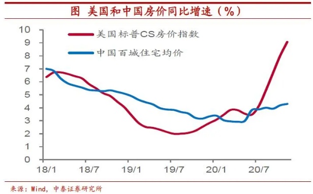 金融资产率先走高。但事实上,发达国家货币增速在去年的一季度末二季度初就已开始逐步攀高,而最先推涨的却是金融类资产和实物资产中金融属性较强的品种。比如2020年中美两国房价双双上行,股票也变得越来越贵,特别是以美国的纳斯达克和我国的创业板为代表的成长股板块,PE估值水平较18-19年上了一个台阶,以黄金为代表的贵金属价格在放水之初也有较大幅度的涨幅。因此,货币环境的支持只是大宗品领涨必要而非充分的条件。