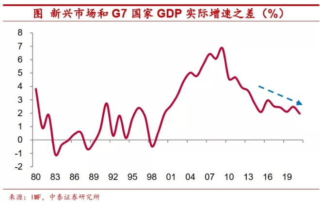另一方面,从2009年以来,全球经济增长状况也显示出,新兴市场国家追赶发达国家的脚步有所放缓,新兴市场经济体增长速度相对于发达经济体之差也持续收敛。根据IMF的最新预测,2021年新兴市场经济体GDP实际增速与发达经济体增速之差将进一步回落至不足2个百分点,这还是将中国考虑在内的结果,否则这一差距将会更小。