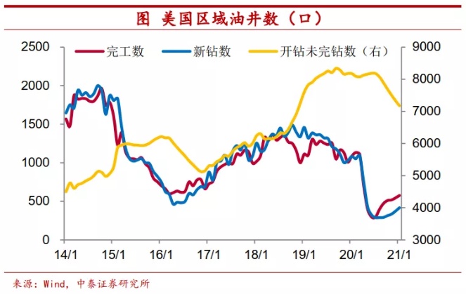 供给状况影响价格上涨的幅度。供给冲击具有一定的随机性和偶然性,相对而言更难预测,但在需求向好加之货币充裕的宏观环境下,一旦供给端受某些事件影响难以扩张,价格的波动就会变得尤为剧烈。特别值得注意的是,去年需求偏弱导致的低价格,使得不少企业产能扩张放缓,从而在一定程度上阻碍今年供给随需求的恢复。例如去年的低油价使得油气公司纷纷削减资本开支,尤其是减少了钻井和完井活动,助推了这次原油价格的上涨。