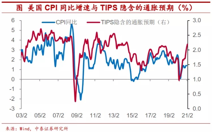 美国通胀预期上升。对于美国而言,以能源和工业品为代表的大宗商品价格上涨,引发了人们对于通胀上行的担忧,美国通胀预期开始出现加速上升。2月以来美国10年期TIPS隐含的通胀预期已经超过了2.1%。一般来说,TIPS所反映的通胀预期会逐渐反映到实际的物价水平上来。