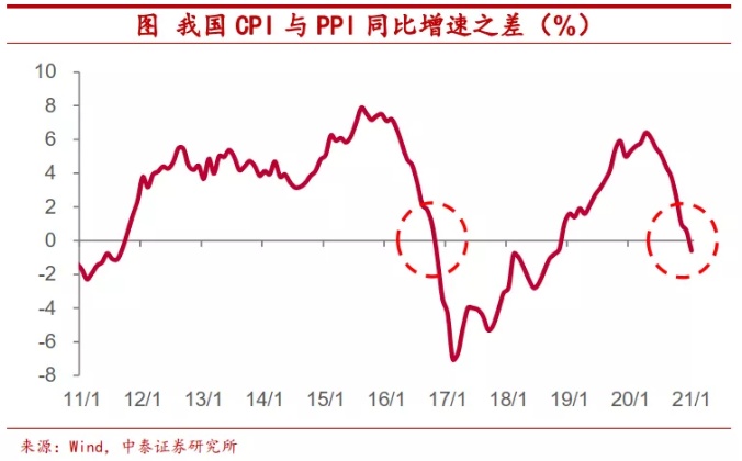 我国存在输入通胀压力。而事实上,全球大宗商品价格的上涨也使得我国存在输入型通胀的压力。2021年1月我国PPI同比增速由负转正,创2019年6月以来增速新高,而1月1%的PPI环比增速也是2016年以来的同期新高。更值得关注的是,1月PPI同比增速已经超过同期CPI的同比增速,这种现象上一次出现还是在2016年11月份。