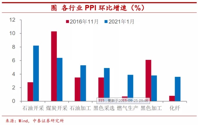 货币政策调整时间或晚于2016年。2016年底那一轮工业品涨价,我国央行政策调整很快,在17年春节前就上调了逆回购利率。但是这一次,我们预计,政策的变化或许比上次要来得晚一些。一方面,2016年底恰逢美国货币政策转向,美联储重启加息,而这次美联储短期政策取向不变;另一方面,与2016年带动PPI增速上行的钢、煤不同,这轮涨价的品种以原油等为代表,更多地和海外需求恢复有关,引发价格上涨的根源并不在国内,因此国内货币政策调整对其价格上涨的抑制作用有限。