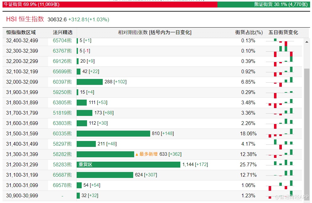 智通财经APP获悉,截至2月23日,恒指最新的牛熊街货比例为70:30。