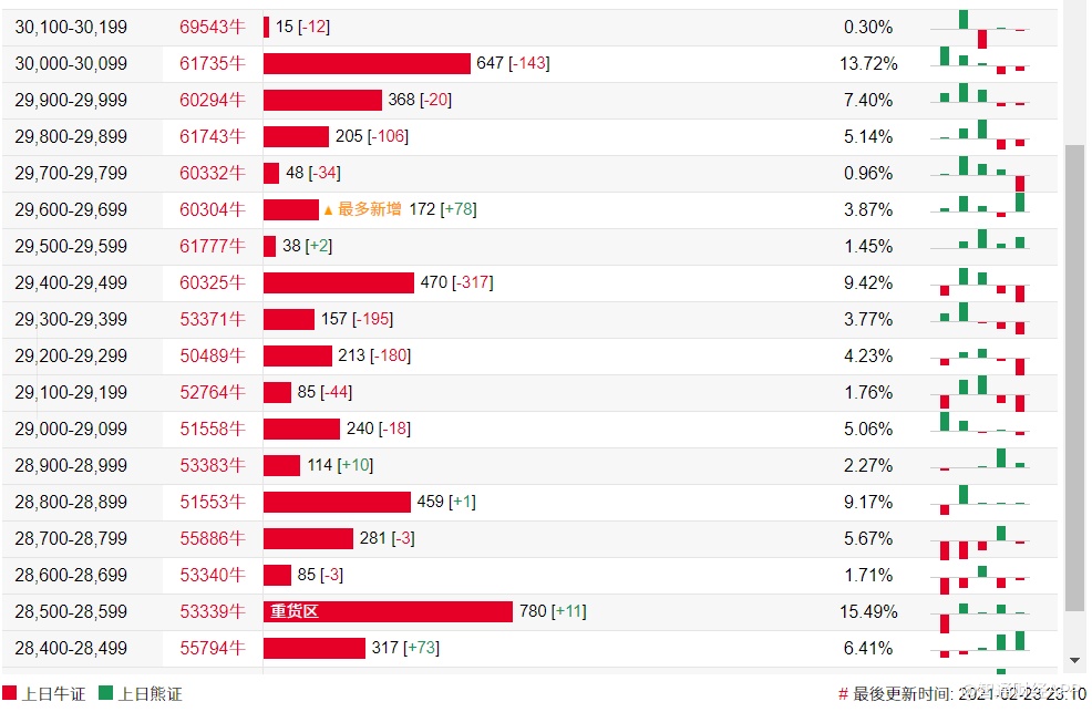法兴恒指牛熊证街货分布图中的数据显示,熊证街货重货区在31200-31299区间,该区间最新熊证数量为1144张,较上一交易日增加172张,最多新增在31300-31399区间,该区间最新熊证数量为633张,较上一交易日增加362张。牛证街货重货区在28500-28599区间,该区间最新牛证数量为780张,较上一交易日增加11张。最多新增在29600-29699区间,该区间最新牛证数量为172张,较上一交易日增加78张。