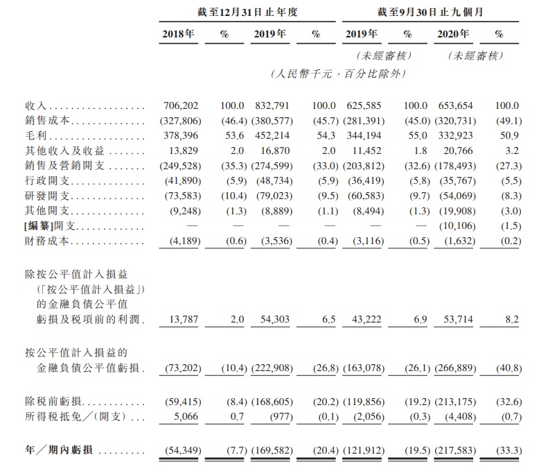 招股书显示,2020前九个月公司收入为6.54亿元,同比增长4%;毛利为3.33亿元,同比下降3%;期内亏损为2.18亿元,上年同期录得亏损1.22亿元。