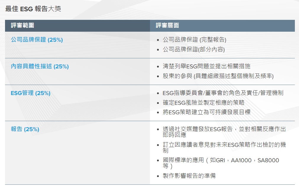 环境、社会及管治大奖的报告质量所见,很多参赛公司不但超越合规要求,同时积极满足日益增长的期望,亦深明ESG价值及由董事会率先推动ESG,不单只为了合规要求。这些公司因此得以拥有良好的竞争优势。评审团十分欣赏得奖企业的认真努力,与他们在ESG报告方面呈现高度独创性的理念及体现出经过深思熟虑后编辑成的ESG表述。”