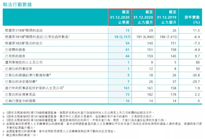 就香港证监会在去年10月到12月的执法行动,主要包括:市场失当行为审裁处 (3宗),法院诉讼(2宗),纪律行动(3家持牌机构、3名人士,罚款27.2亿),限制通知书 (1家券商的3个账户),市场监察(2157项索取要求、3宗股权高度集中);并就就跨境证券犯罪行为的执法合作事宜,香港证监会法规执行部、中国证监会稽查局、香港警务处商业罪案调查科、公安部证券犯罪侦查局四方进行了深入讨论。