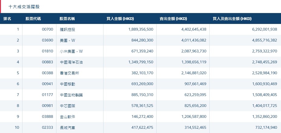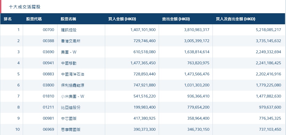 此外,思摩尔国际(06969)获净买入4364万港元。而金山软件(03888)、中海油(00883)、中芯国际(00981)分别遭净卖出10.6亿、7.93亿、1.88亿港元。