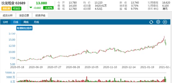 然而,对于这份纯利大增七成的中期业绩,市场却似乎并不买账。中期业绩发布后次日,玖龙纸业在前期创下阶段新高16.62港元的基础上,跳空低开单日暴跌12.48%,收至13.74港元。而截至今日(2月24日),公司股价未能止住跌势,续跌近5%,盘中一度跌至12.76港元,后收至13.08港元,两日累计跌幅接近17%。