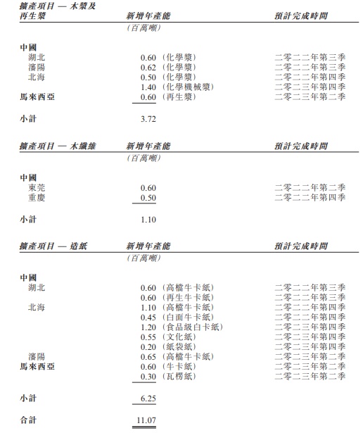 此次披露的产能扩张计划包括了312万吨/年木浆、60万吨/年再生浆、110万吨/年木纤维,以及625万吨/年造纸产能。大部分新产能都位于国内,将在2022年第二季度至2023年第四季度陆续投产;玖龙纸业在马来西亚则将建设60万吨/年再生浆、60万吨/年牛卡纸以及30万吨/年瓦楞纸产能,预计都将于2023年第二季度投产。