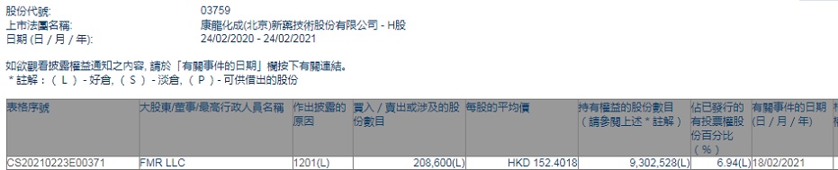 智通财经APP获悉,香港联交所最新资料显示,2月18日,FMR LLC减持康龙化成(03759)20.86万股,每股作价152.4018港元,总金额约为3179.1万港元。减持后最新持股数目约为930.3万股,最新持股比例为6.94%。