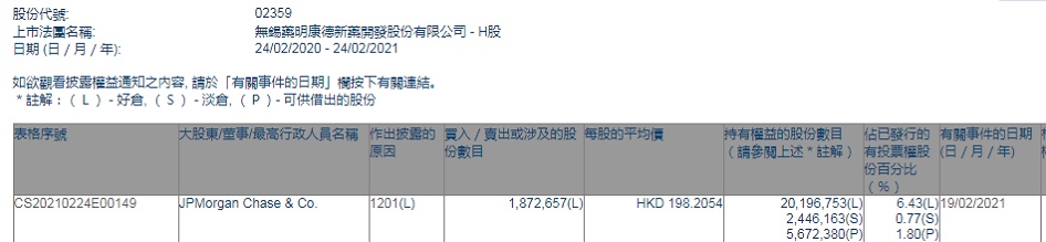 智通财经APP获悉,香港联交所最新资料显示,2月19日,摩根大通减持药明康德(02359)187.2657万股,每股作价198.2054港元,总金额约为3.71亿港元。减持后最新持股数目约为2019.7万股,最新持股比例为6.43%。