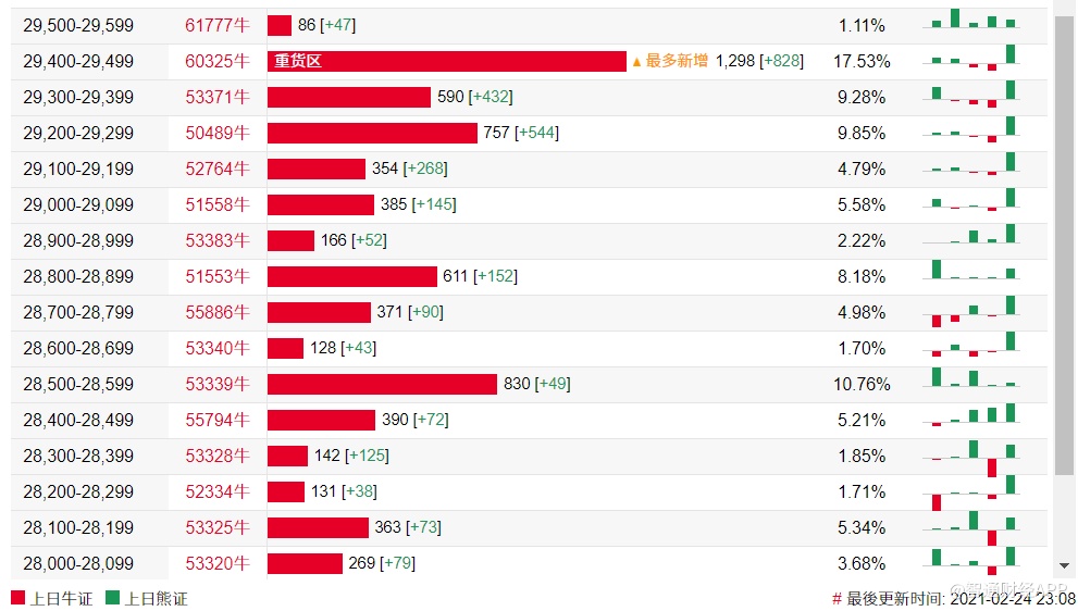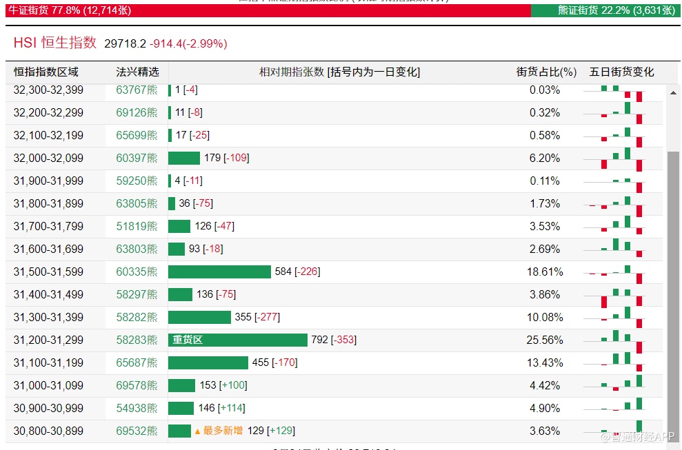 法兴恒指牛熊证街货分布图中的数据显示,熊证街货重货区在31200-31299区间,该区间最新熊证数量为792张,较上一交易日减少353张,最多新增在30800-30899区间,该区间最新熊证数量为129张,较上一交易日增加129张。牛证街货重货区在29400-29499区间,该区间最新牛证数量为1298张,较上一交易日增加828张。最多新增也在该区间。
