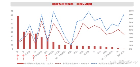 由于中国肝癌患者大多数拥有病毒性肝炎或肝硬化,疾病发展较为迅速,57%患者在第一次诊断时已达晚期或终末期,因此肝癌五年生存率极低。