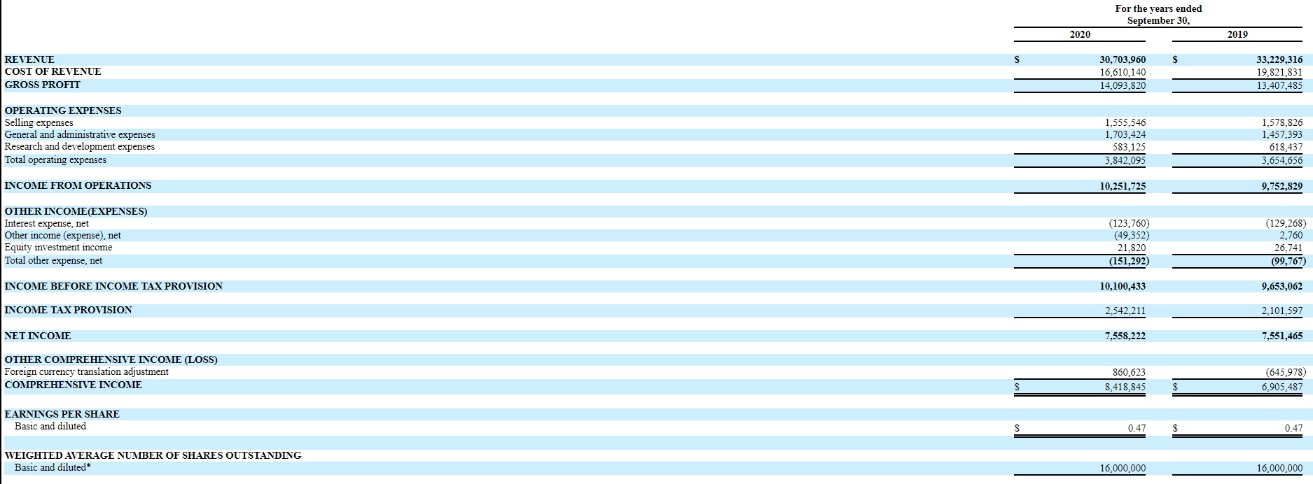 智通财经APP获悉,大自然药业(UPC.US)在近日提交给SEC的文件中更新了财务数据,公布了截至2020年9月30日的2020财年财报。招股书显示,截至2020年9月30日,营收同比下降8%,净利润与上年同期基本持平。