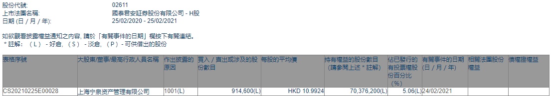智通财经APP获悉,香港联交所最新资料显示,2月24日,上海宁泉资产管理有限公司增持国泰君安(02611)91.46万股,每股作价10.9924港元,总金额约为1005.36万港元,增持后最新持股数目7037.62万股,最新持股比例为5.06%。