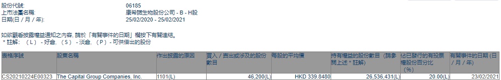 智通财经APP获悉,香港联交所最新资料显示,2月23日,美国资本集团增持康希诺生物-B(06185)4.62万股,每股作价339.848港元,总金额约为1570.1万港元,增持后最新持股数目为2653.6431万股,最新持股比例为20%。