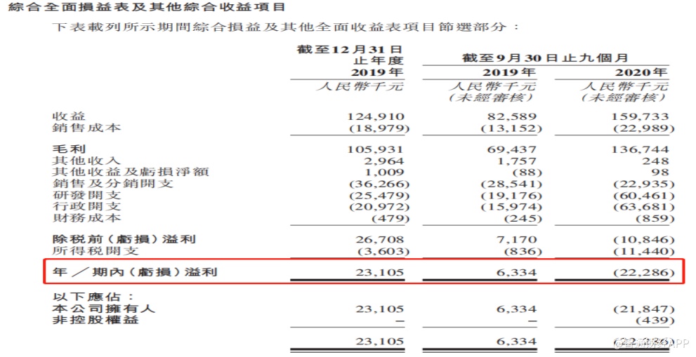 公司于PTA球囊产品及DCB产品推出后开始确认收益。于2019年及截至2020年9月30日止九个月,产品销售收益分别为1.25亿元及1.6亿元。其中,2020年前三季度销售收入同比增长93.4%。上述期间销售毛利率分别达到84.8%和85.6%。
