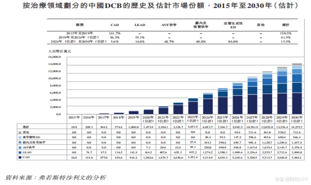 根据弗若斯特沙利文报告,中国DCB产品市场仍处于其初步发展阶段。DCB首次获批于中国用于治疗CAD(冠状动脉疾病)后,DCB的市场份额由2015年的2690万元显著上升至2019年的10亿元,复合年增长为150.5%。随着治疗其他血管疾病的DCB产品适应症预期将扩大,中国DCB产品预期将于2024年进一步攀升至60亿元,2019年至2024年的复合年增长为41.5%,且于2030年进一步上升至143亿元,2024年至2030年的复合年增长为15.5%。