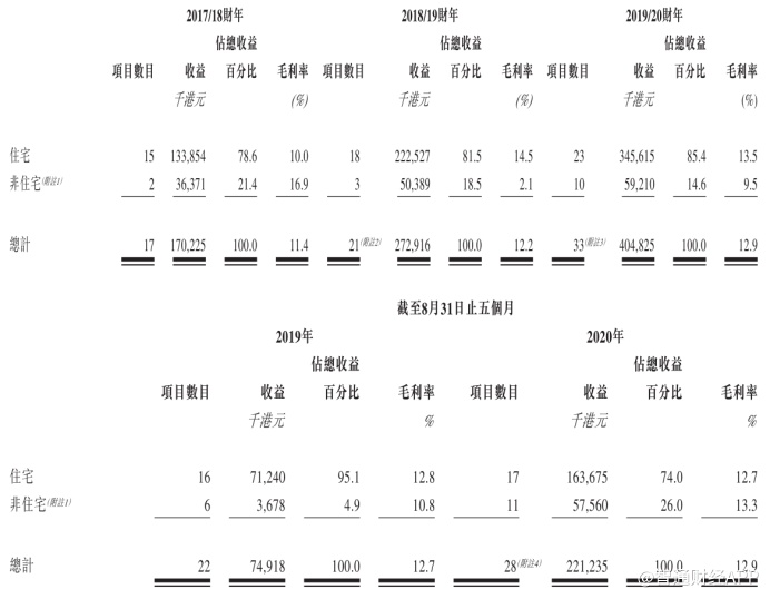 其中,在公司参与的发展项目类型中,主要以住宅项目为主,贡献总收入占比均达70%以上。于2019年8月31日止五个月,住宅项目贡献收入更是达到7124万港元,占收入比重达95.1%。截至2020年8月31日止五个月,非住宅收入则增长较快,达5756万港元,占收比由上年同期的4.9%增至26%。