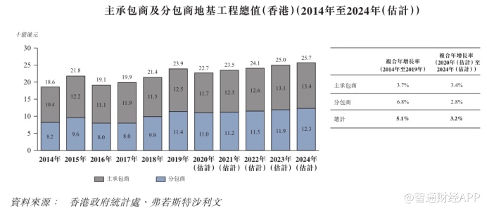 行业增长方面,据弗若斯特沙利文报告,分包商所开展的地基工程总值由2014年约82亿港元增至2019年约114亿港元,复合年增长率为6.8%。随着整体地基工程的增长,分包商自2020年至2024年的复合年增长率将达2.8%。未来几年内,行业或面临增速放缓困境。