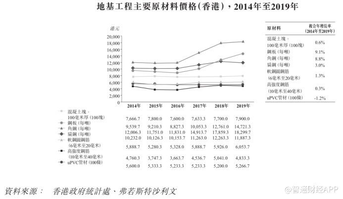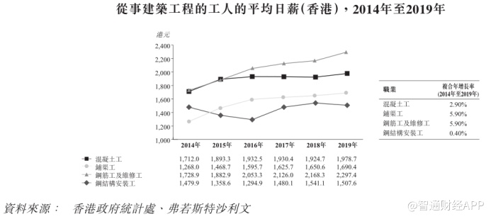 与此同时,据香港政府统计处的资料,自2014年至2019年,混凝土工、铺渠工、钢筋工及维修工,以及钢结构安装工等从事工程工作工人的平均日薪均有所上涨。其中,铺渠工、钢筋工及维修工的薪资涨幅最高,复合年增长率为约5.9%。平均日薪上涨导致香港地基工程承包商的经营成本升高。