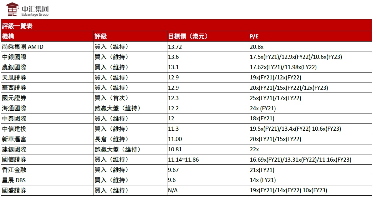 智通财经APP获悉,中汇集团(00382)此前自愿公布2021财年Q1业务进展:业绩潜力持续释放。而良好的业绩令多家大行看好中汇,纷纷发布研报上调盈利预测。其中,尚乘集团AMTD和中银国际分别给予13.72港元和13.6港元目标价;其余机构均给予9.6至13.1港元不等,均给予“买入”或“跑赢大盘”评级。总平均目标约为11港元。