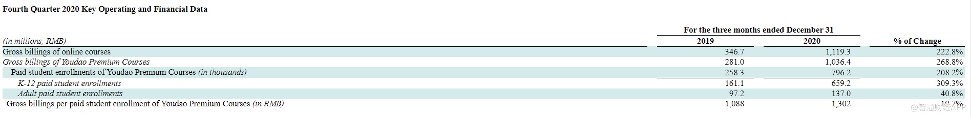 智通财经APP发现,2020年第四季度时,有道精品课的正价课付费学生人次为79.62万人,同比增长208.2%;其中,K12正价课付费学生人次大增309.3%至65.92万人,成人课程付费学生人次同比增长40.8%至13.7万人。与此同时,有道精品课客单价同比增长近20%至1302元人民币。在付费学生人次与付费价格均增长的带动下,总账单大增222.8%至11.19亿元。