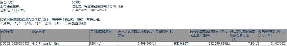 智通财经APP获悉,香港联交所最新资料显示,2月24日,GIC Private Limited减持洛阳钼业(03993)549.9万股,每股作价6.9871港元,总金额约为3842.2万港元。减持后最新持股数目约为3.126亿股,最新持股比例为7.95%。
