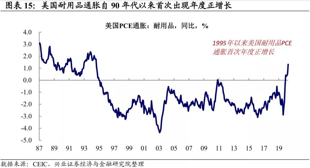 “发钱”将继续刺激耐用消费品价格上涨。在大型财政刺激下,美国耐用品价格出现了自90年代以来的首次上涨。2020年耐用品价格环比上升最快的时间分别对应了两轮财政刺激。未来拜登1.9万亿刺激计划在2021年都将继续刺激耐用消费品价格上涨。
