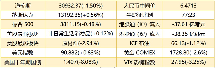 1、 截至上周五美股收盘,道琼斯指数跌469.64点,跌幅1.50%,报30932.37点;标普500指数跌18.19点,跌幅0.48%,报3811.15点;纳斯达克综合指数涨72.91点,涨幅0.56%,报13192.35点。港股ADR指数走高,按比例计算,收报29122点,涨141.63点或0.49%。