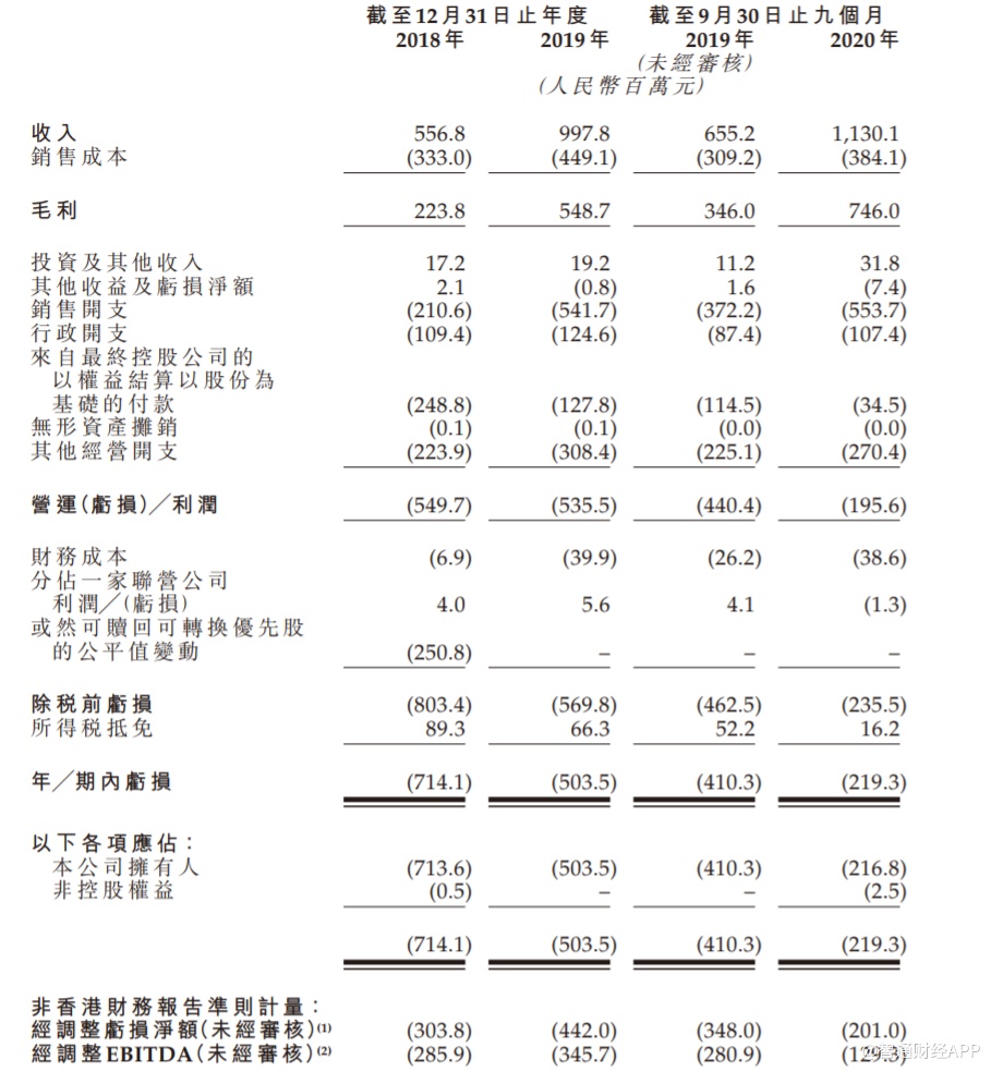 截至2019年及2020年9月30日止九个月,公司收入分别为6.552亿元、11.301亿元,期内亏损分别为4.103亿元、2.193亿元。