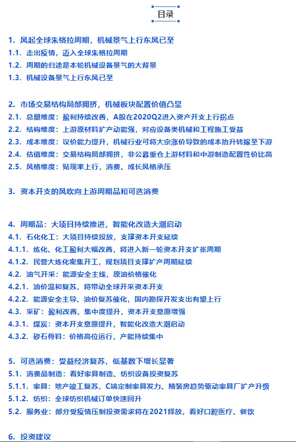 2020年疫情冲击后,内外格局变化,工业企业盈利改善自5月开始保持着较强的延续性。我们认为疫后2021年将是上一轮朱格拉周期的归途,机械设备行业景气度将明显改善,关注传统领域龙头和新兴领域成长对设备类的拉动。