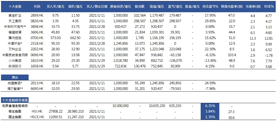 2021年来十大金股组合跑赢恒指2.51%,3月换入中国平安(02318)和中车时代电气(03898)。2021年来十大金股组合回报率为6.35%,跑赢恒生指数2.51%。考虑到家电上游原材料涨价对海尔智家(06690)或产生负面影响,3月组合调出海尔智家和微盟集团(02013),换入中国平安(02318)和中车时代电气(03898)。过往组合中表现较好的分别为天工国际(00826)、微盟集团、万科企业(02202)、紫金矿业(02899)和腾讯控股(00700),回报率分别为29.85%、24.59%、22.30%、17.95%和15.62%。