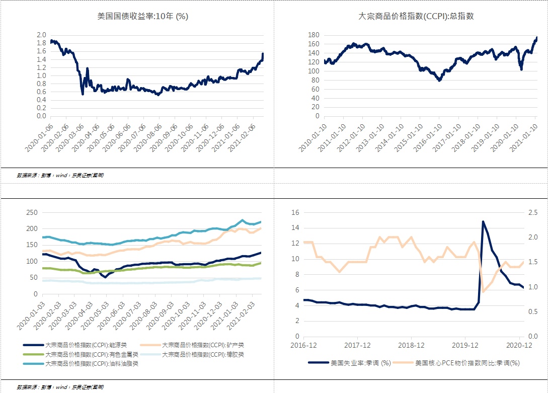 美债收益率短期上行空间应该有限,若后续上行过快不排除美国展示军事强权以及祭出YCC的可能性。十年期美债收益率自2020年8月的最低点上升102bps至25日的1.54%,受到美国对叙利亚的空袭等消息影响,十年期美债收益率26日回落至1.44%。2月24日联储主席鲍威尔就半年度货币政策执行情况向国会发表证词,表示经济复苏尚不充分,在充分就业和通胀取得重大进展后才会考虑缩减购债规模,态度整体仍偏鸽派。从就业角度看,2021年1月美国季调失业率达6.3%,仍高于疫情前3.5%左右的失业率水平,充分就业的目标显然尚未达到;从通胀角度来看,美国2020年核心PCE物价指数同比平均为1.4%,仍低于美联储2%的平均通胀目标,而且考虑到美国巨量债务的情形,美联储货币政策暂时难以转向。短期来看,美债利率可能会继续上行,但上行空间应该不大,若上行过快不排除美国展现军事强权和美联储进行YCC的可能性。