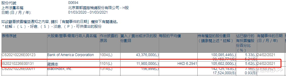 智通财经APP获悉,香港联交所最新资料显示,2月24日,蒋锦志增持北京首都机场股份(00694)1190万股,每股作价6.2941港元,总金额约为7489.98万港元。增持后最新持股数目约为1.06亿股,最新持股比例为5.62%。