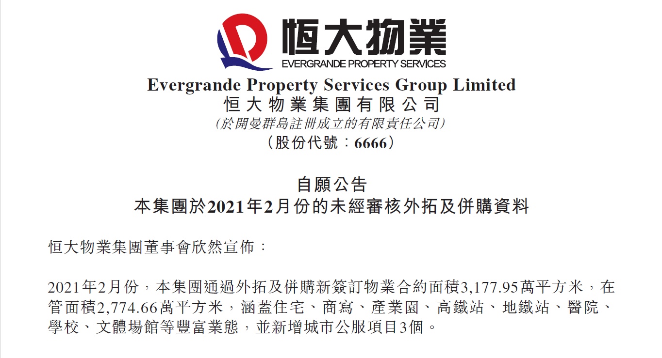 3月1日,恒大物业发布公告,2月份通过外拓及并购新签订物业合约面积3177.95万平方米,在管面积2774.66万平方米,涵盖住宅、写字楼、产业园、高铁站、地铁站、医院、学校、文体场馆等丰富业态,并新增城市公服项目3个。