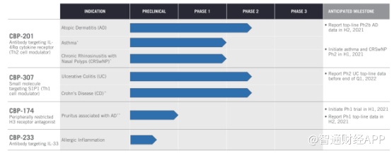 此外,康乃德还在同步推进CBP-174小分子候选药物、CBP-233靶向IL-33的抗体等临床前项目,用于治疗多种严重的炎症性疾病。目前这两项研究尚处在临床前阶段。