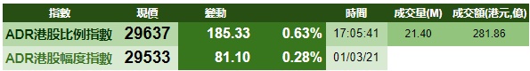 智通财经APP获悉,周一美股三大指数齐涨,港股ADR指数上涨,按比例计算,收报29637点,涨185.33点或0.63%。