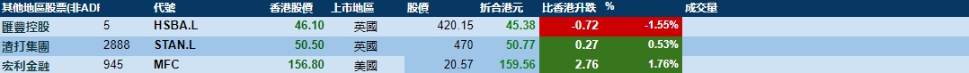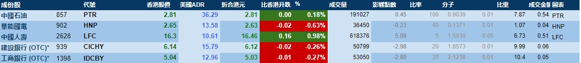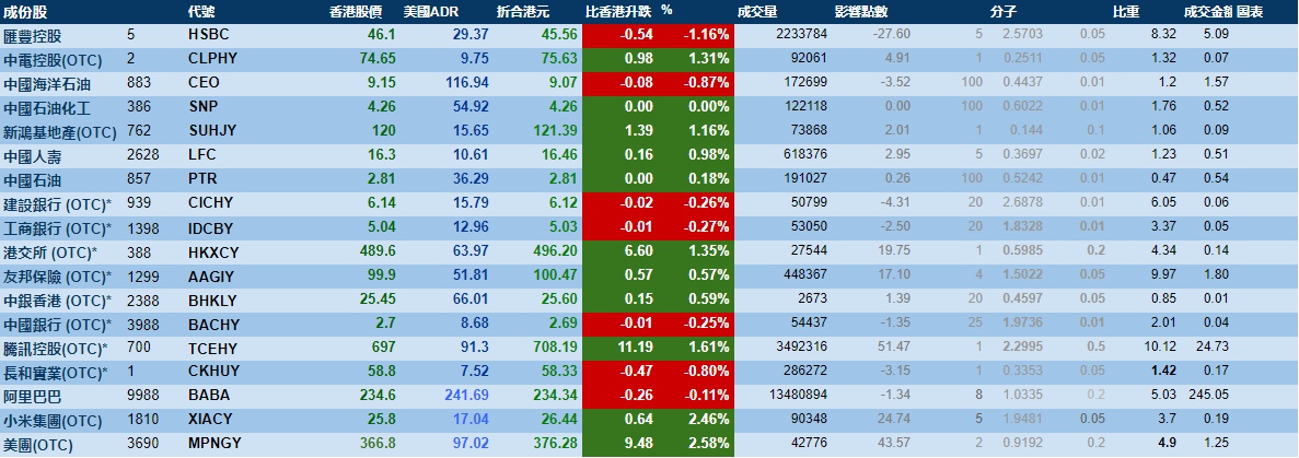 大型蓝筹股涨跌互现,汇丰控股收报45.56港元,较港收市跌1.16%;腾讯控股收报708.19港元,较港收市涨1.61%。具体如下:
