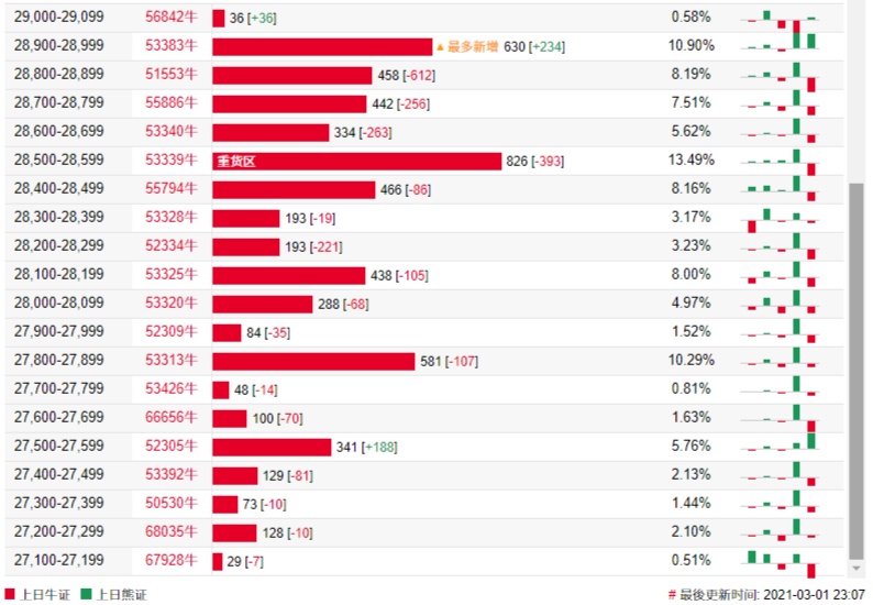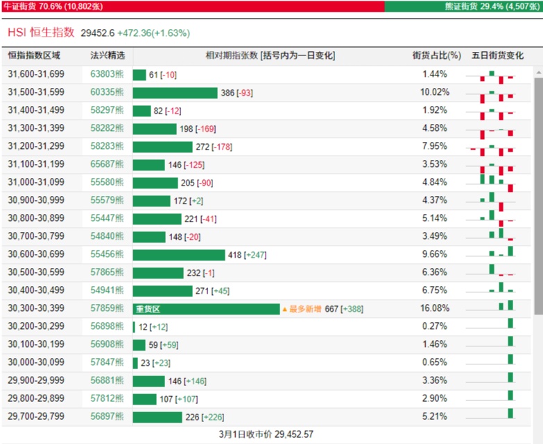 法兴恒指牛熊证街货分布图中的数据显示,熊证街货重货区在30300-30399区间,该区间最新熊证数量为667张,较上一交易日增加388张,最多新增也在该区间。牛证街货重货区在28500-28599区间,该区间最新牛证数量为826张,较上一交易日减少393张。最多新增在28900-28999区间,该区间最新牛证数量为630张,较上一交易日增加234张。