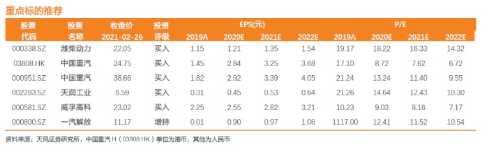 21年重卡行业销量或再次超出市场预期,板块内标的有望继续受益预期差的修复带来的盈利和估值双升。继续推荐重卡行业龙头潍柴动力(02338)、治理改善的中国重汽A/H(03808)、布局空气悬架的重卡曲轴龙头天润工业、受益国六升级的威孚高科、整车龙头一汽解放。
