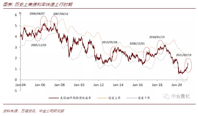 2021年2月,受到全球疫情控制、美国经济向好、通胀压力上升、算法交易共振等多重因素影响,美债收益率持续上升,美国10年期国债收益率在2021年2月19日上穿通道上界。