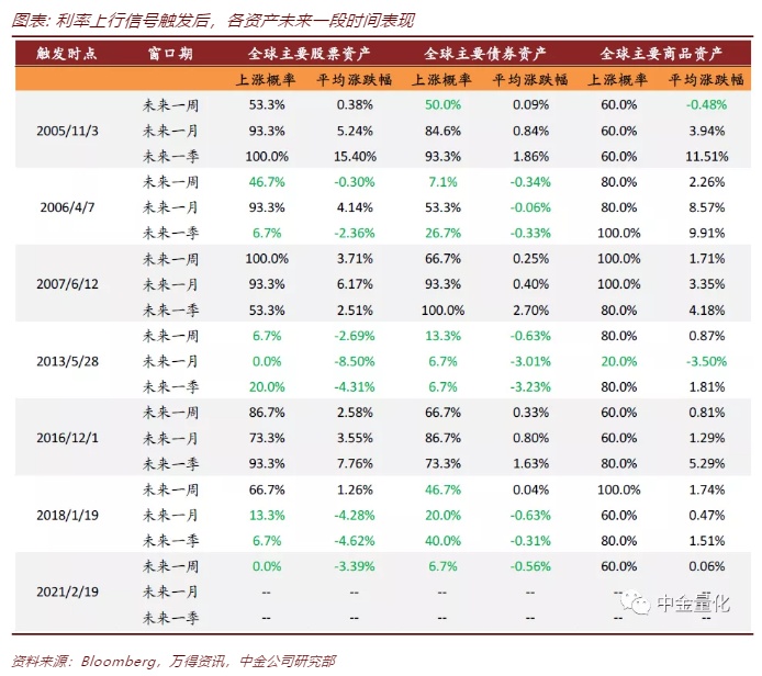 我们分别统计了前文定义的美债利率快速上行信号触发后,未来1周、1月、1季度内全球主要股票资产、债券资产、商品资产的涨跌幅。从结果看,当美债利率快速上行后,商品资产有较大概率出现上涨,股票和债券资产涨跌不一,但两者涨跌同步性较强。