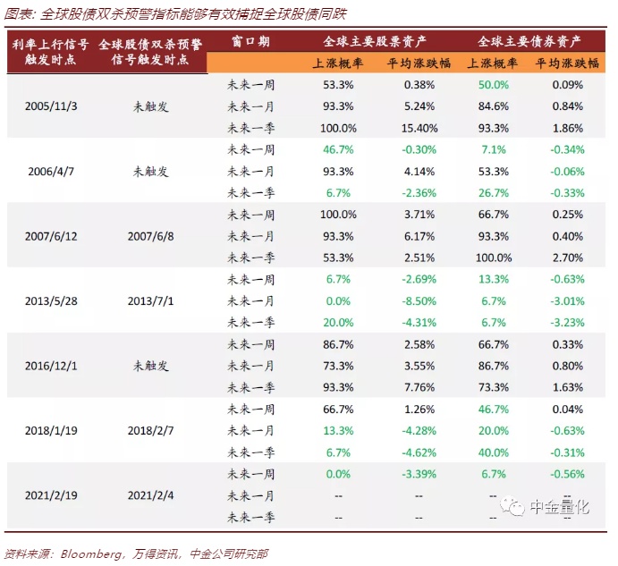 全球股债双杀预警指标2004年以来触发四次,均为前文量化定义的美债利率上行时期,有效捕捉2010年以来的三次下跌。全球股债双杀预警指标从2004年以来一共触发四次,分别在2007年6月8日、2013年7月1日、2018年2月7日和2021年2月4日,恰好对应前文量化定义的四次美债利率上行时期。从近10年来看,2013年、2018年、2021年的三次因利率上行所引发的全球股债同跌,预警指标均可有效进行捕捉。